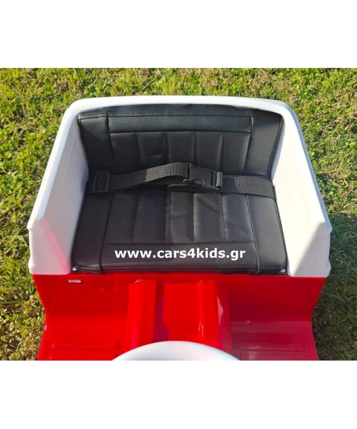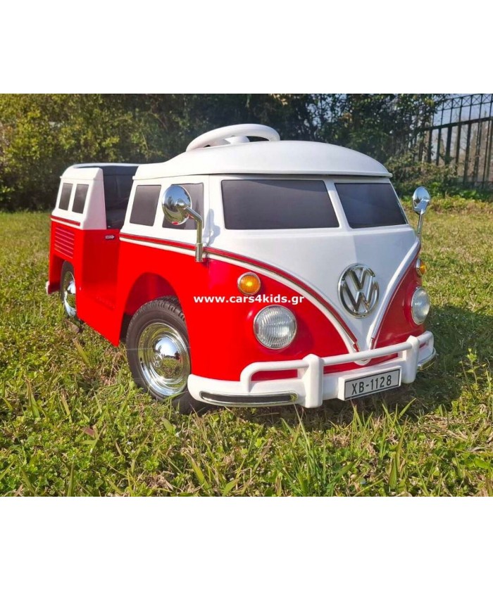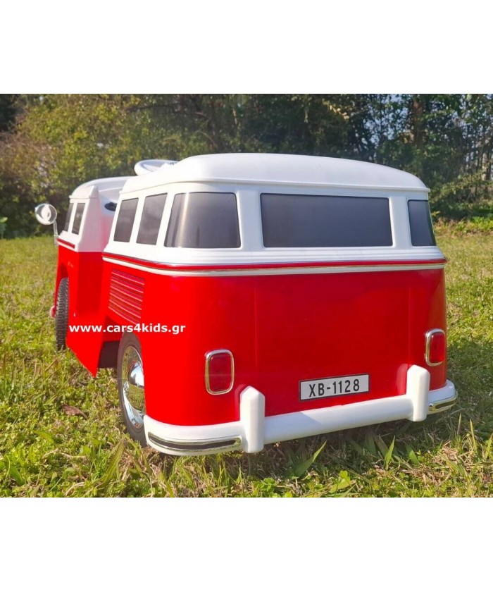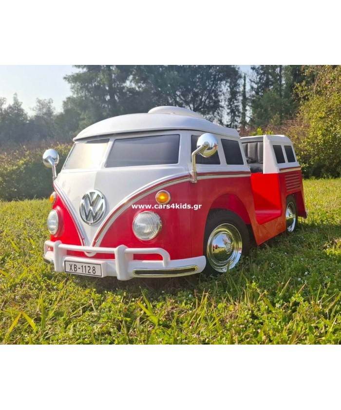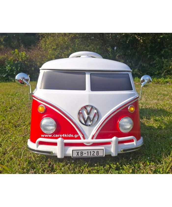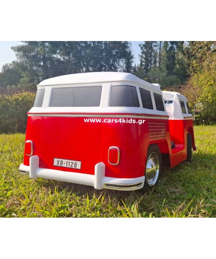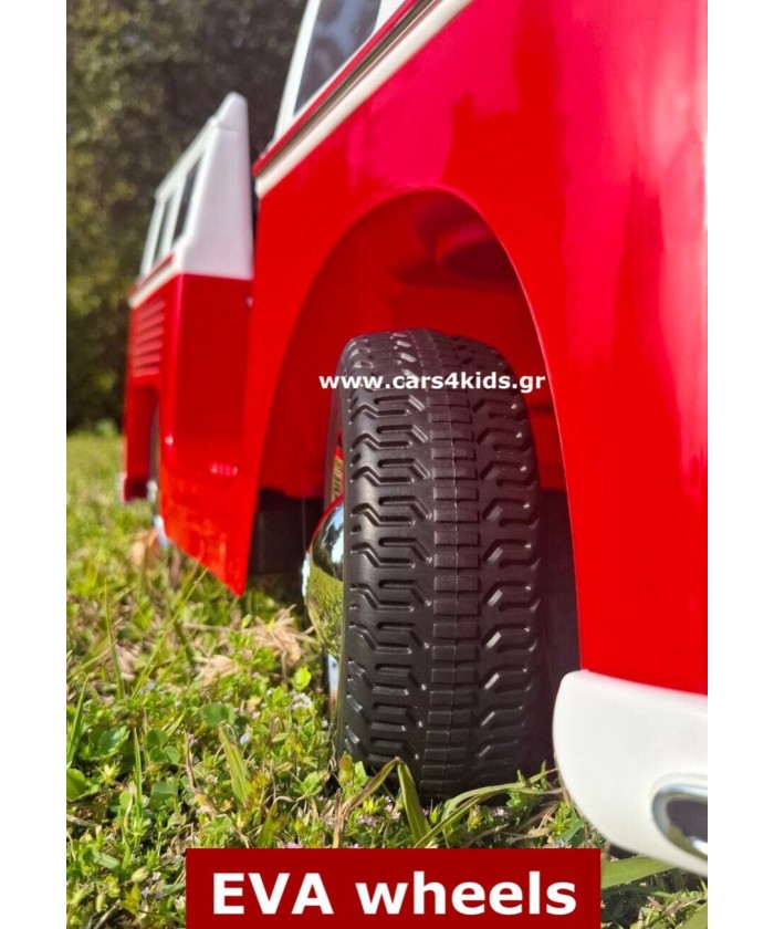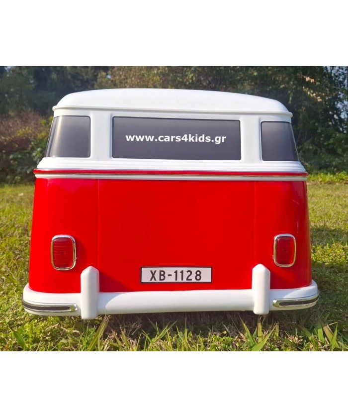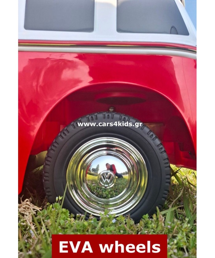 Volkswagen T1 turns on with a button and a realistic engine sound can be heard.It has 12Volt rechargeable battery that lasts 1-2 hours depending on the weight and way of use of the child.