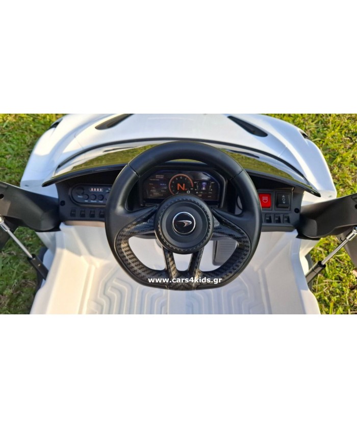 The 4x4 Mclaren 765LT turns on with button and a realistic engine sound can be heard and it has 12Volt rechargeable battery that lasts 1-2 hours depending on the weight and way of use of the child with battery indicator built in to the dashboard.
